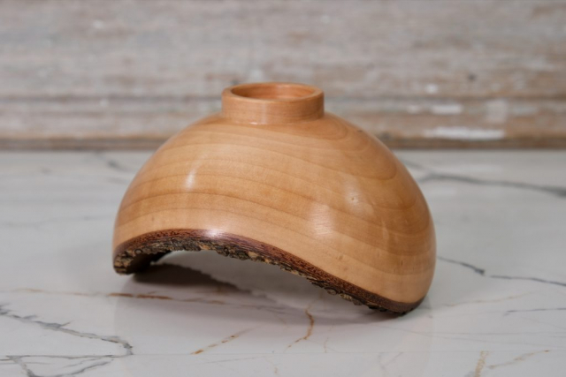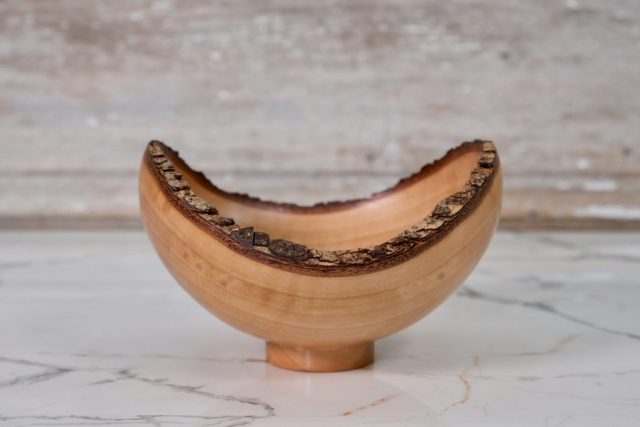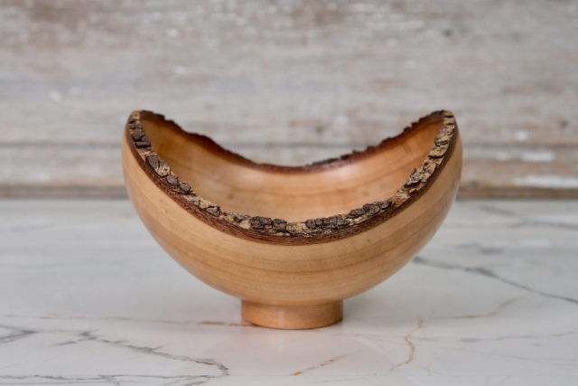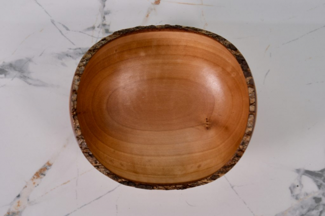 This fun little handcrafted bowl is slightly oval and measures 4.75″ long, 4.5″ wide, and 3.1″ high. The natural bark edge is what you get when you reverse the orientation of the log during turning. It would make a lovely gift or look great on your coffee table or bookshelf. It could also hold your rings, earrings, or watch.